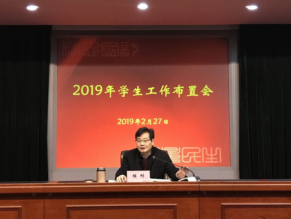 2月27日上午,我校2019年学生工作布置会在闻厅二楼报告厅召开。会议由校党委副书记程刚主持。各学院学生工作书记、全体辅导员,学工部(学生处、招就处)、团委全体人员,研工部从事思想政治工作人员参加会议。
