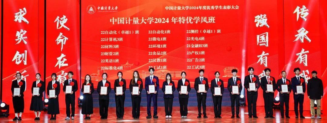 会上表彰了2024年中国计量大学特优学风班,陈永强为班级学生代表颁奖。