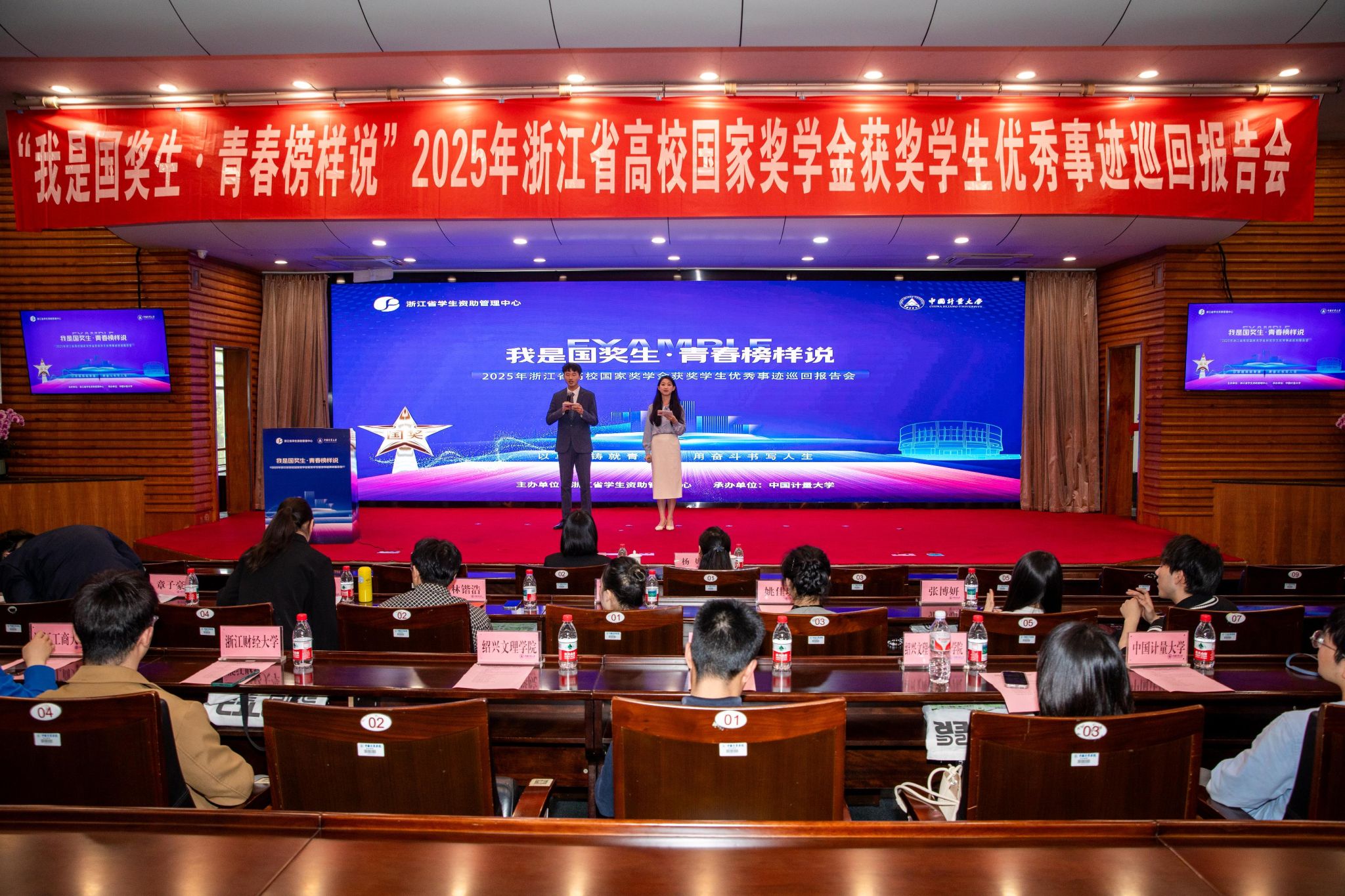 为全面落实党的二十大关于青年人才培养的重要精神,充分发挥国家奖学金获奖学生的示范引领作用,2025年4月24日下午,由浙江省教育发展中心主办、中国计量大学承办,“我是国奖生・青春榜样说”2025年浙江省普通高校国家奖学金获奖学生优秀事迹巡回报告会在我校闻厅二楼报告厅举办。来自省内九所高校的杰出青年代表齐聚我校,以青春叙事传递奋斗力量,用榜样之光引领成长航向,为量大学子带来一场精神洗礼与思想启迪的盛会。浙江省教育发展中心、浙江省学生资助管理中心干部陈琴,学生处处长杨娜,各学院辅导员及学生代表参加了此次报告会。
