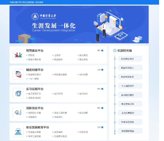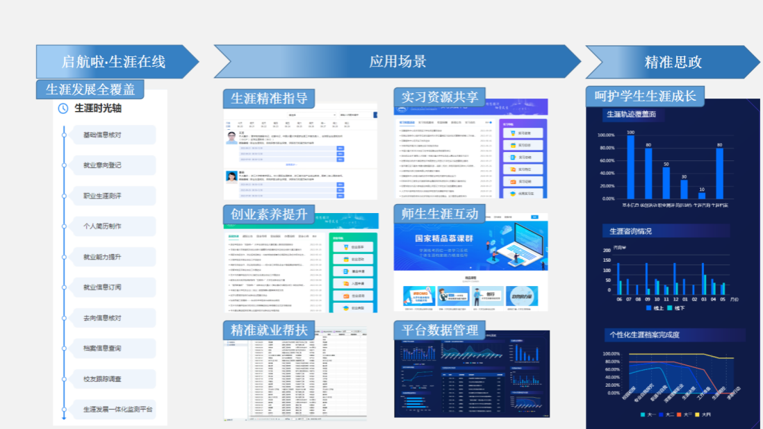 系统由智慧就业平台、精准对接平台、实习实践平台、创新创业平台、职业发展教育平台、生涯驾驶舱6大平台组成。其中,职业发展教育平台为学生生涯发展提供精准化指导;智慧就业平台为学生提供就业资讯与指导;精准帮扶平台聚焦重点帮扶群体,着力解决毕业生求职难、就业难等问题,全面促进我校毕业生高质量充分就业。